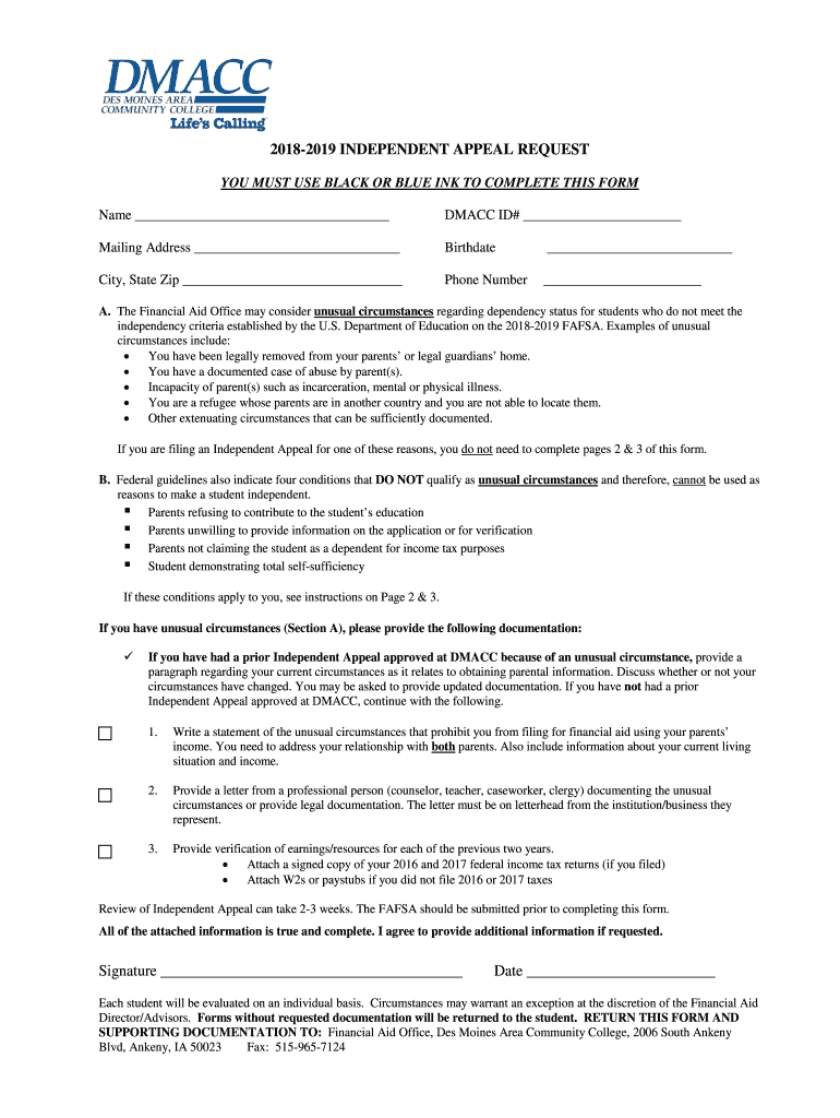 20182019 INDEPENDENT APPEAL REQUEST YOU MUST USE BLACK OR BLUE INK TO COMPLETE THIS FORM Name DMAIC ID# Mailing Address Birthdate City, State Zip Phone Number A. The Financial Aid Office may consider