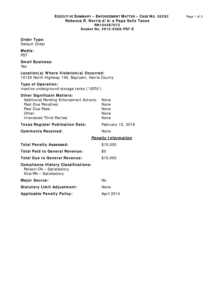 EXECUTIVE SUMMARY ENFORCEMENT MATTER CASE NO. 50292 Rebecca R. Norris d/b/a Father Solid Tacos RN104367073 Docket No. 20150468PSTEOrder Type: Default Order Media: PST Small Business: Yes Location(s)