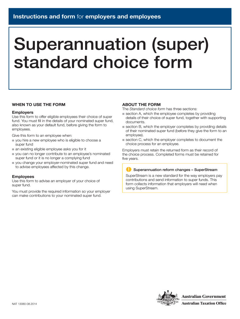 Any employee who is eligible for superannuation contributions needs to fill out the superannuation super standard choice form.