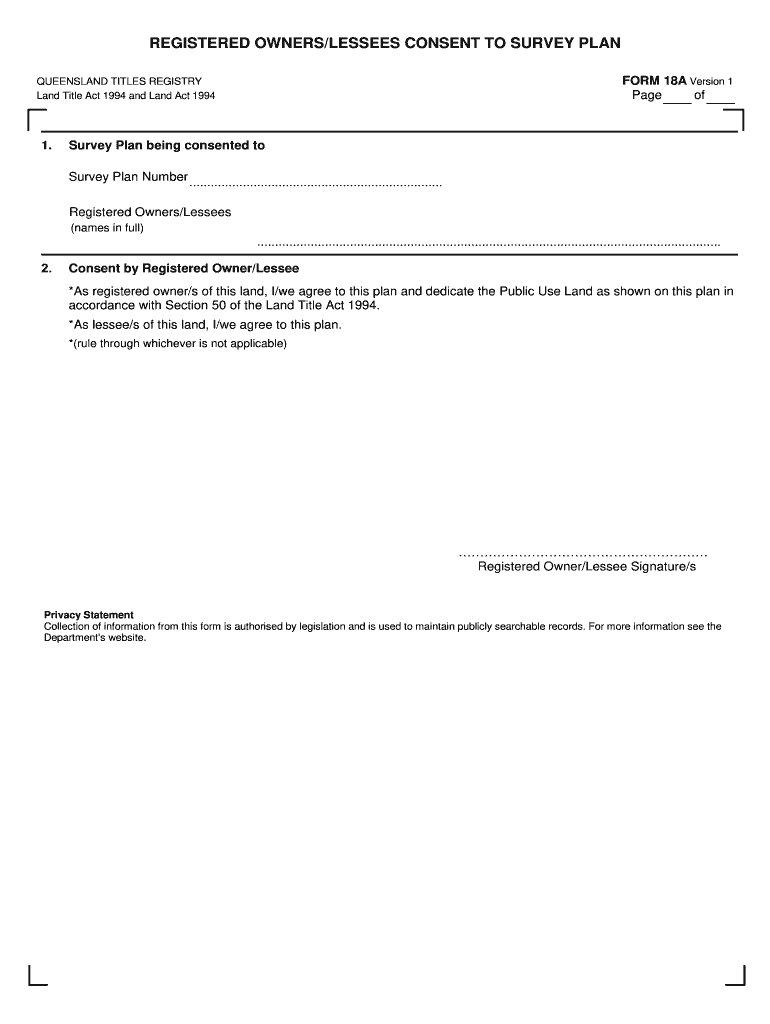 REGISTERED OWNERS/LESSEES CONSENT TO SURVEY PLAN FORM 18A Version 1 Page of QUEENSLAND TITLES REGISTRY Land Title Act 1994 and Land Act 19941. Survey Plan being consented to Survey Plan Number .......................................................................