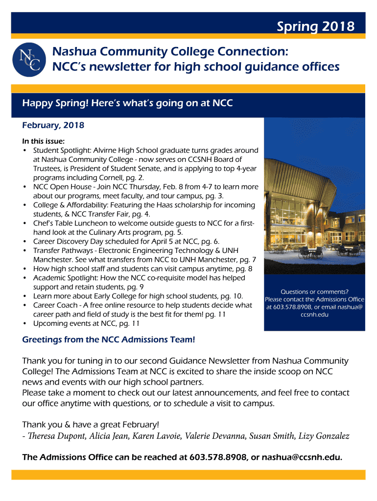 Spring 2018 Nashua Community College Connection: CCS newsletter for high school guidance offices Happy Spring! Here's what's going on at NCC February 2018 In this issue: Student Spotlight: Alpine