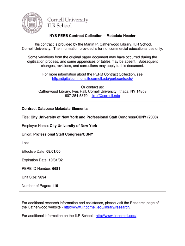 NYS PER Contract Collection Metadata Header This contract is provided by the Martin P. Cather wood Library, ILL School, Cornell University. The information provided is for noncommercial educational