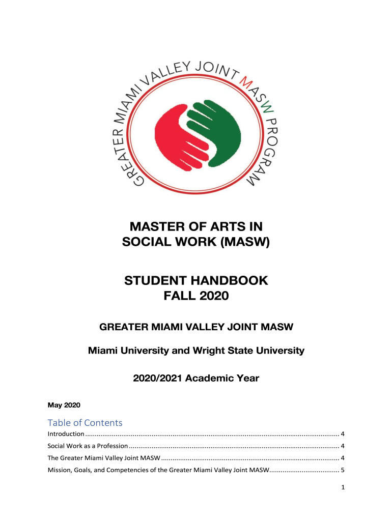 MASTER OF ARTS IN SOCIAL WORK (MASS) STUDENT HANDBOOK FALL 2020 GREATER MIAMI VALLEY JOINT MASS Miami University and Wright State University 2020/2021 Academic Year May 2020Table of Contents Introduction