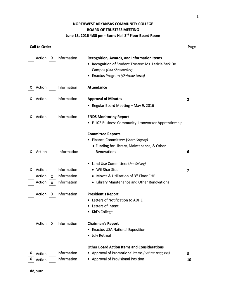 1 NORTHWEST ARKANSAS COMMUNITY COLLEGE BOARD OF TRUSTEES MEETING June 13, 2016 4:30 pm Burns Hall 3rd Floor Board Room Call to Order Action Page XInformationRecognition, Awards, and Information Items
