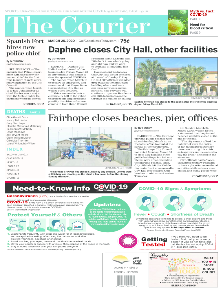 SPORTS: Updates on golf, tennis and more during COVID-19 pandemic, PAGE 1516Myth vs. Fact: COVID19The Courier Spanish Fort hires new police chiefMARCH 25, 2020 GulfCoastNewsToday.com guy gulfcoastmedia.com