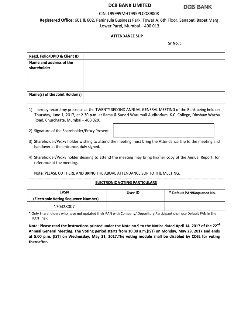 DCB BANK LIMITED IN: L99999MH1995PLCO89008 Registered Office: 601 & 602, Peninsula Business Park, Tower A, 6th Floor, Separate BAPAAT Mary, Lower Pearl, Mumbai 400 013 ATTENDANCE SLIP Sr No. 51650##