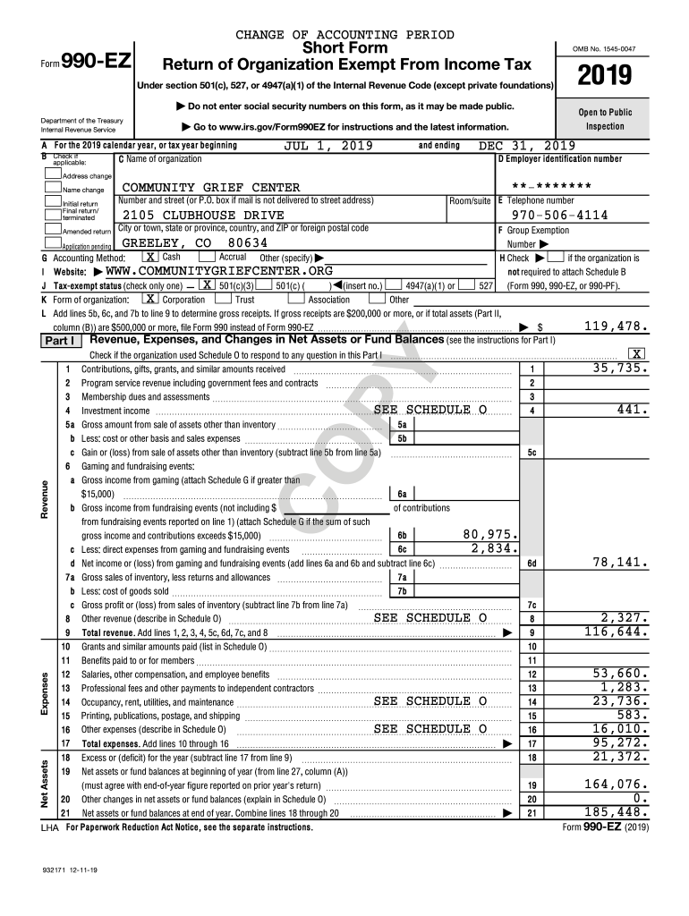 CHANGE OF ACCOUNTING PERIODForm990EZShort Form Return of Organization Exempt From Income Tax OMB No. 15450047Under section 501(c), 527, or 4947(a)(1) of the Internal Revenue Code (except private foundations)