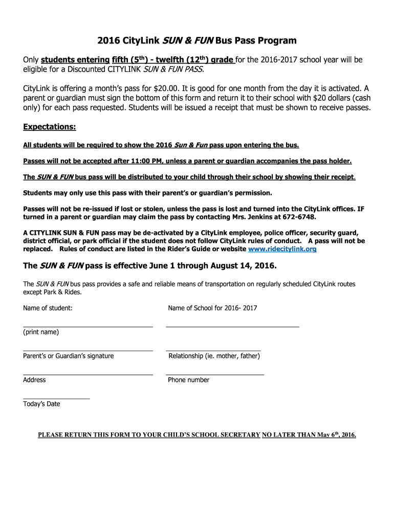 2016 Citing SUN & FUN Bus Pass Program Only students entering fifth (5th) twelfth (12th) grade for the 20162017 school year will be eligible for a Discounted CITING SUN & FUN PASS. Citing is offering