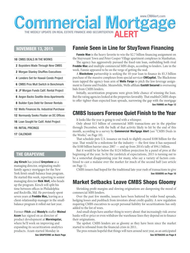 NOVEMBER 13, 201510CMBS DEALS IN THE WORKS2Buysiders Wade Through New CMBS2Morgan Stanley Shuffles Executives4Lenders Set for Hawaii Condo Project6CMBS Pros Mull Switch in Benchmark6JP Morgan Funds