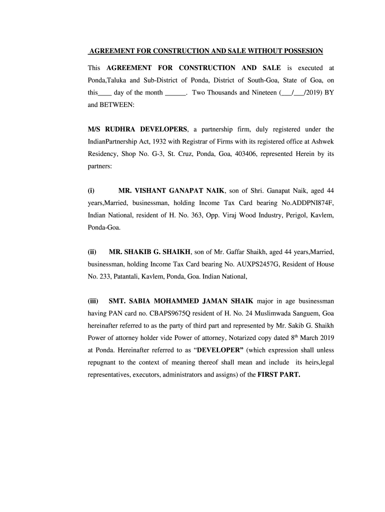 AGREEMENT FOR CONSTRUCTION AND SALE WITHOUT POSSESSION This AGREEMENT FOR CONSTRUCTION AND SALE is executed at Pond, Talk and District of Pond, District of South Goa, State of Goa, on this day of