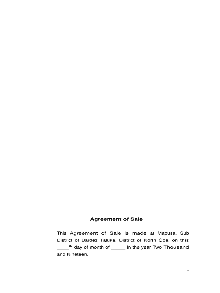 Agreement of Sales Agreement of Sale is made at Maps, Sub District of Border Talk, District of North Goa, on this TH day of month of in the year Two Thousand and Nineteen.1BETWEEN1. (i)MR. , son of