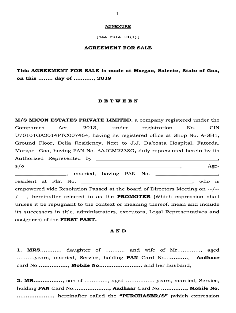 1ANNEXURE See rule 10(1) AGREEMENT FOR Sales AGREEMENT FOR SALE is made at Margo, Salute, State of Goa, on this. Day of., 2019BETWEENM/SM ICON ESTATES PRIVATE LIMITED, a company registered under the