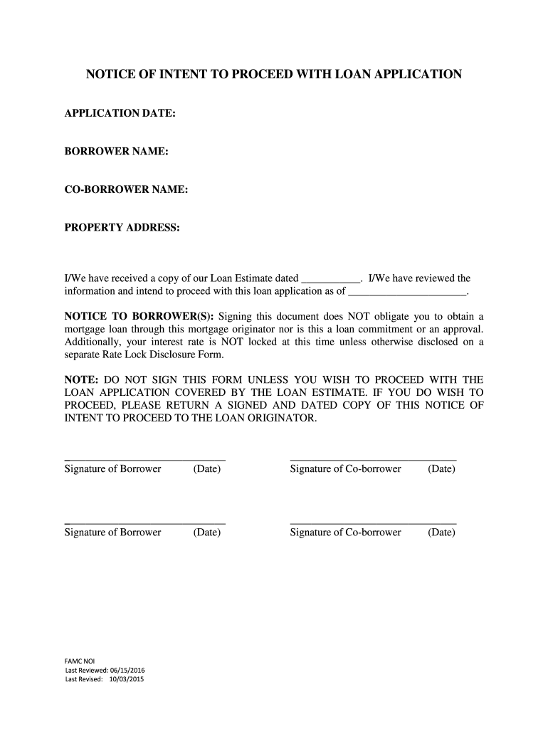 NOTICE OF INTENT TO PROCEED WITH LOAN APPLICATION DATE:BORROWER NAME:BORROWER NAME:PROPERTY ADDRESS:I/We have received a copy of our Loan Estimate dated. I/We have reviewed the information and intend