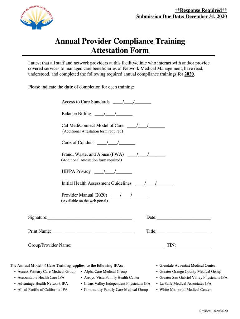 **Response Required** Submission Due Date: December 31, 2020Annual Provider Compliance Training Attestation Form I attest that all staff and network providers at this facility/clinic who interact