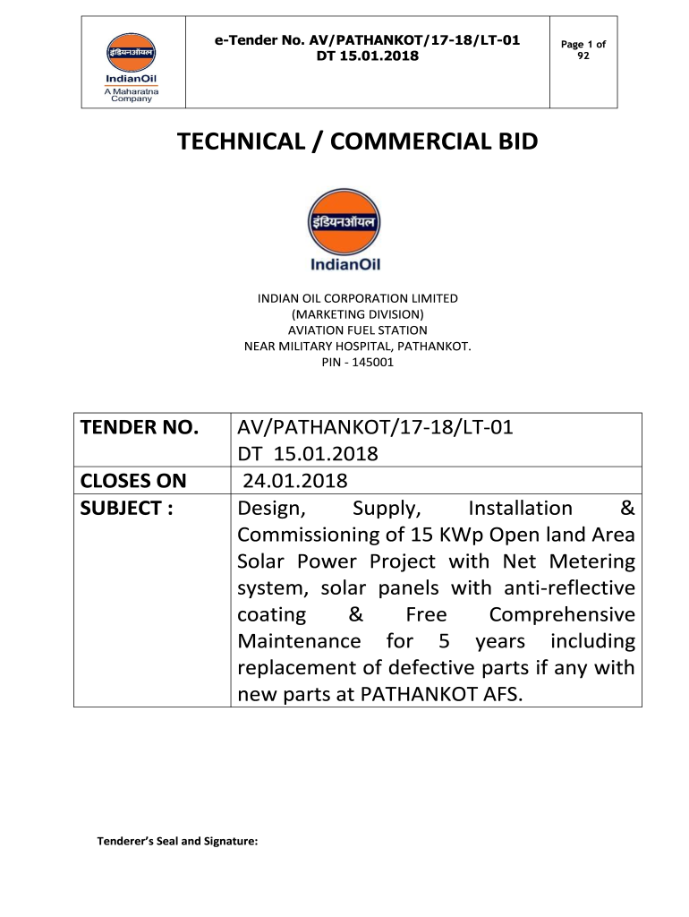 Tender No. AV/NATHANSON/1718/LT01 DT 15.01.2018Page 1 of 92TECHNICAL / COMMERCIAL INDIAN OIL CORPORATION LIMITED (MARKETING DIVISION) AVIATION FUEL STATION NEAR MILITARY HOSPITAL, NATHANSON. PIN 145001TENDER