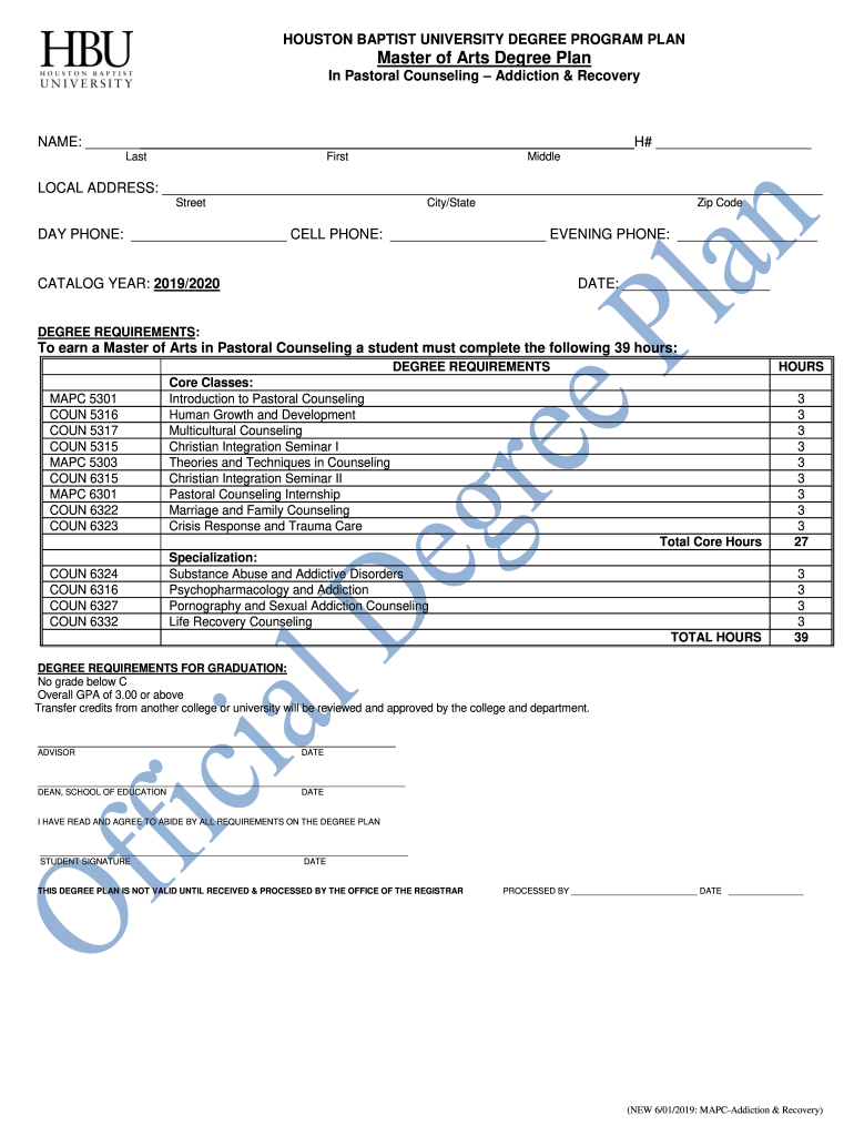 HOUSTON BAPTIST UNIVERSITY DEGREE PROGRAM PLAN Master of Arts Degree Plan In Pastoral Counseling Addiction & RecoveryNAME: H# LastFirstMiddleLOCAL ADDRESS: Streetcar/State Comedy PHONE: CELL PHONE: