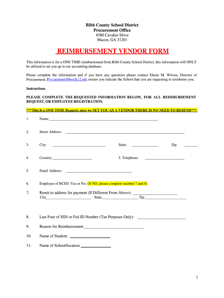 Get the free reimbursement vendor form - Bibb County School District