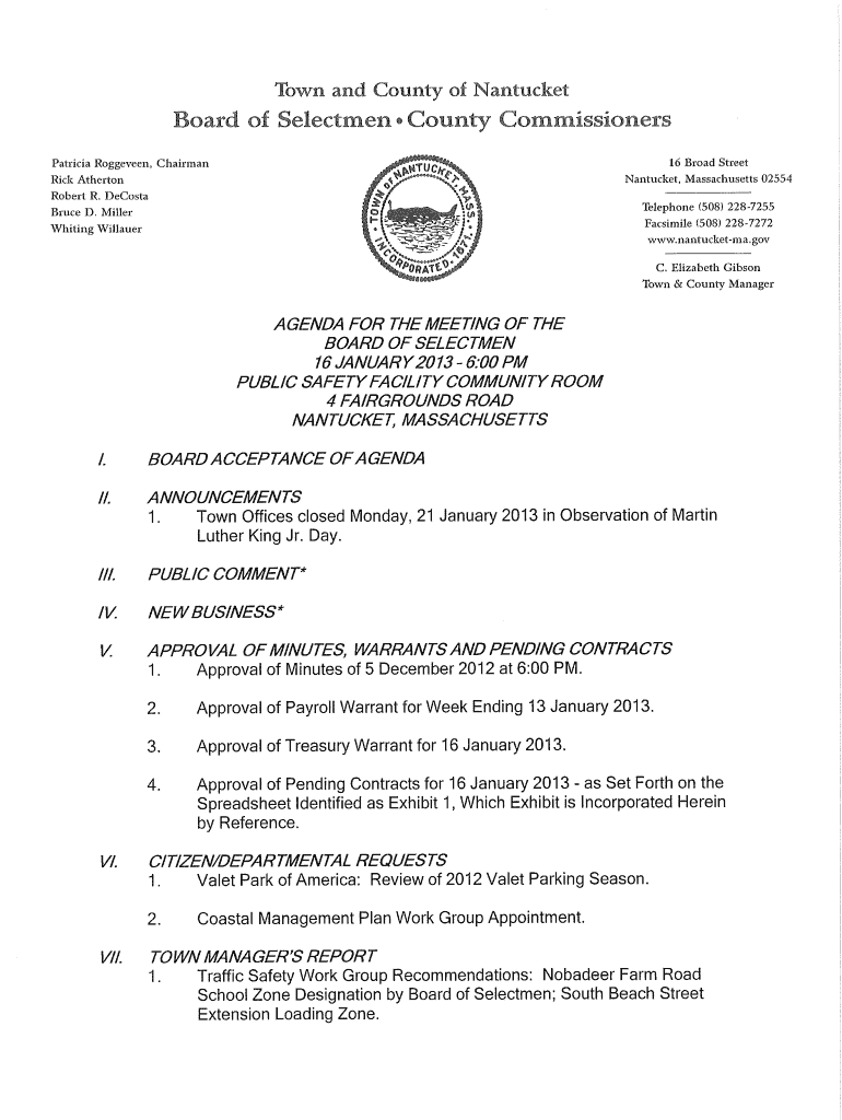 EXHIBIT 1 AGREEMENTS TO BE EXECUTED BY TOWN MANAGER UNLESS RESOLUTION OF DISAPPROVAL BY BOARD OF SELECTMEN January 16, 2013***AMENDED JANUARY 11, 2013***Type of Agreement/DescriptionDepartmentWithConsulting