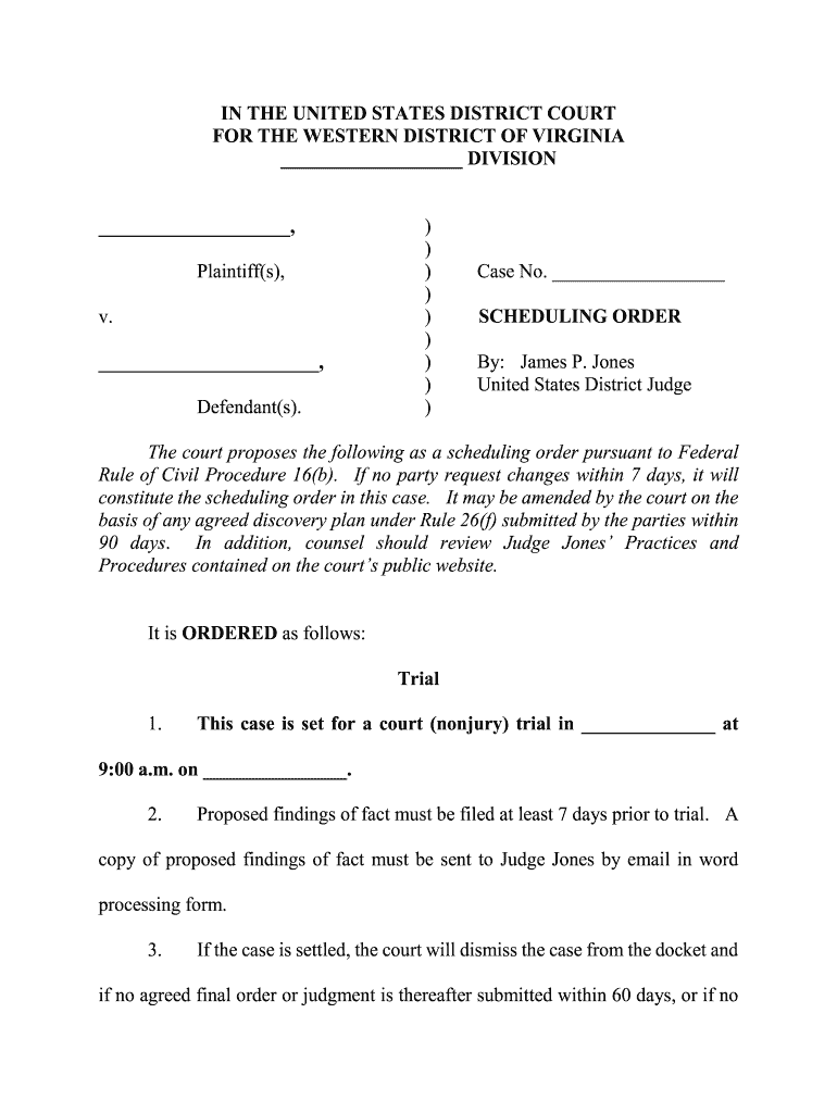 IN THE UNITED STATES DISTRICT COURT FOR THE WESTERN DISTRICT OF VIRGINIA DIVISION, Plaintiff(s), v., Defendant(s).) ))))))))Case No. SCHEDULING ORDER By: James P. Jones United States District Budget
