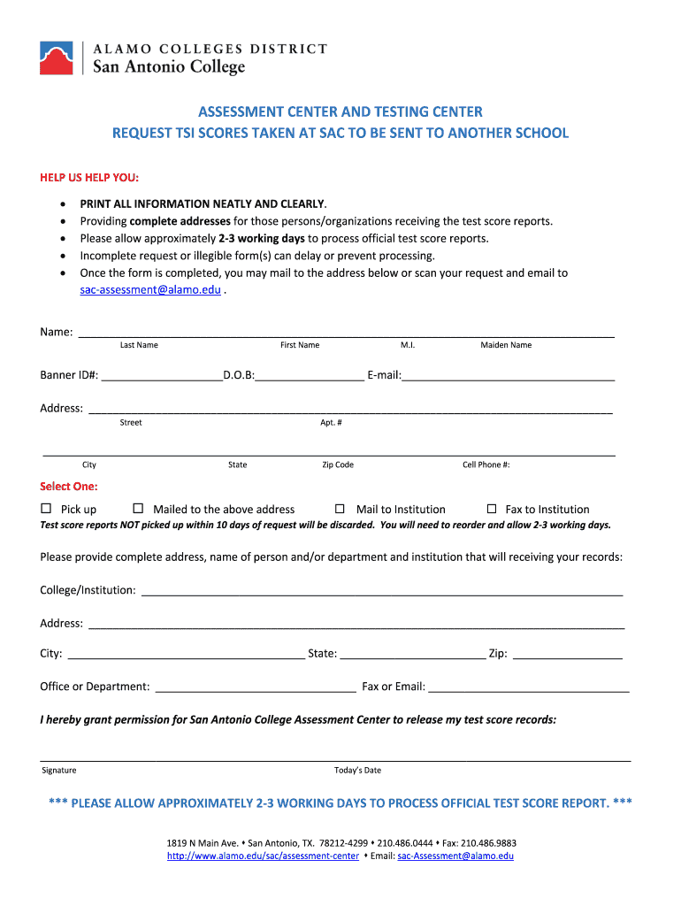 ASSESSMENTCENTERANDTESTINGCENTER REQUESTTSISCORESTAKENATSACTOBESENTTOANOTHERSCHOOL HELPUSHELPYOU: PRINTALLINFORMATIONNEATLYANDCLEARLY. Providingcompleteaddressesforthosepersons/organizationsreceivingthetestscorereports.