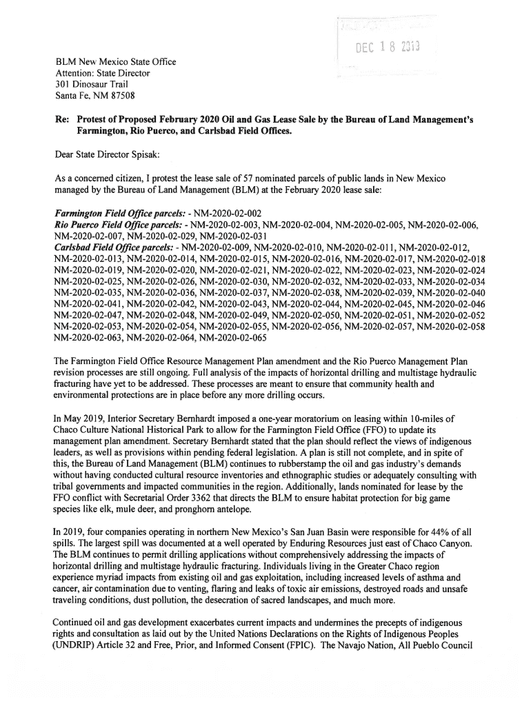 DEC 1 8 Z '.LD BLM New Mexico State Office Attention: State Director 301 Dinosaur Trail Santa Fe. NM 87508 Re: Protest of Proposed February 2020 Oil and Gas Lease Sale by the Bureau of Land Management's