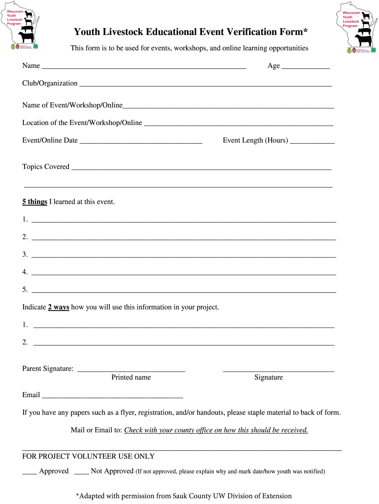 Youth Livestock Educational Event Verification Form* This form is to be used for events, workshops, and online learning opportunities Name Age Club/Organization Name of Event/Workshop/Online Location