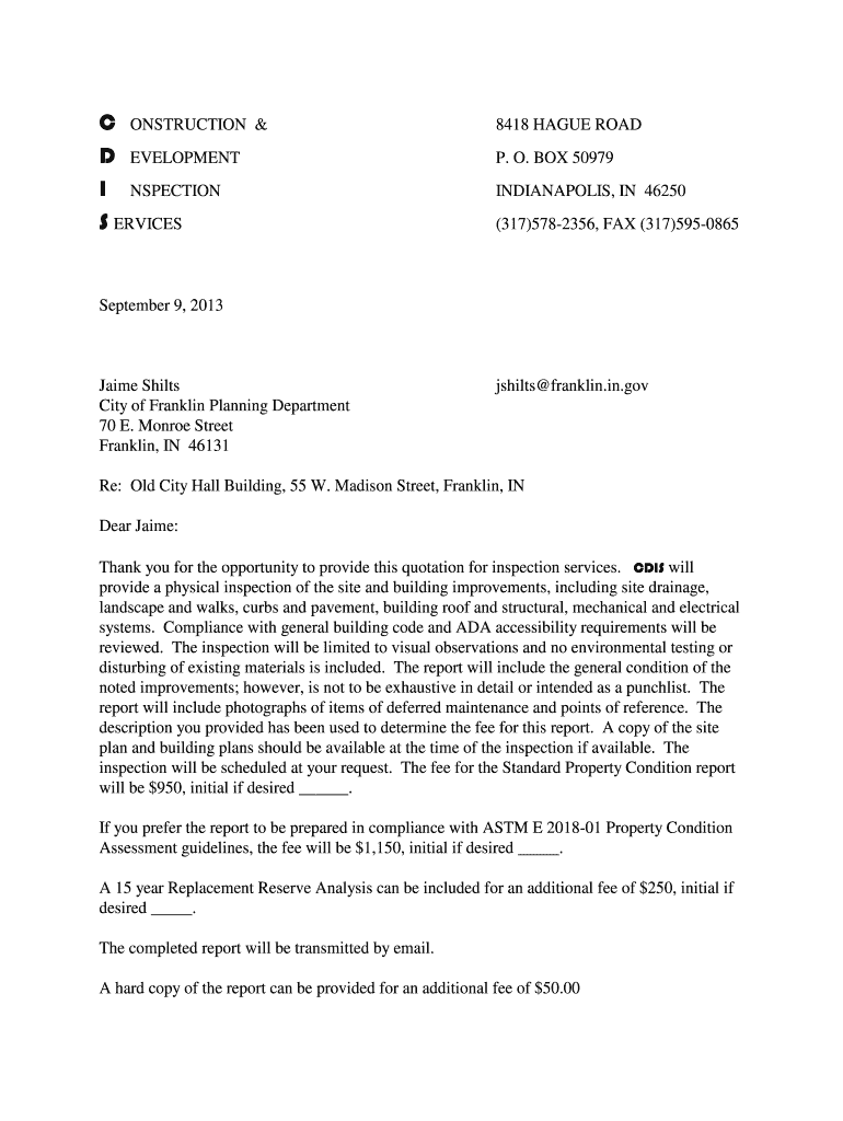 C CONSTRUCTION D DEVELOPMENT I INSPECTION S ERVICES&8418 HAGUE ROAD P. O. BOX 50979 INDIANAPOLIS, IN 46250 (317)5782356, FAX (317)5950865September 9, 2013Jaime Shifts City of Franklin Planning Department