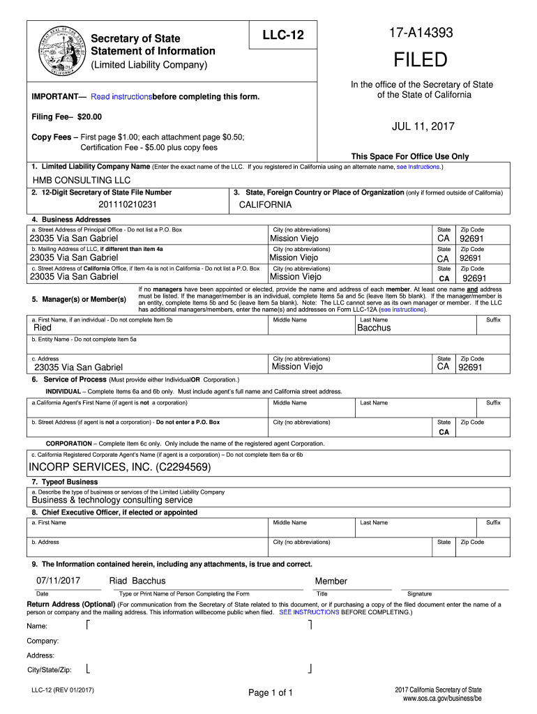 17A14393LLC12Secretary of State Statement of Information (Limited Liability Company)FILEDIMPORTANT Read instructions before completing this form. In the office of the Secretary of State of the State
