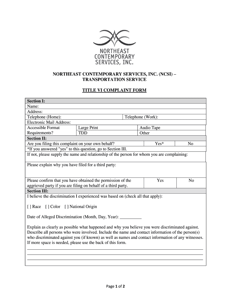 NORTHEAST CONTEMPORARY SERVICES, INC. (CSI) TRANSPORTATION SERVICE TITLE VI COMPLAINT FORM Section I: Name: Address: Telephone (Home): Telephone (Work): Electronic Mail Address: Accessible Format