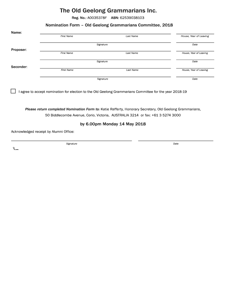 The Old Geelong Grammarians Inc. Reg. No.: A0035378FABN: 62539038103Nomination Form Old Geelong Grammarians Committee, 2018 Name: Proposer: Seconder: First Nameless Name House, Year of LeavingSignatureFirst