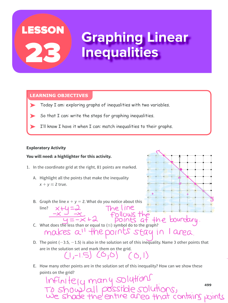 LESSONGraphing Linear Inequalities23LEARNING OBJECTIVESToday I am: exploring graphs of inequalities with two variables. So that I can: write the steps for graphing inequalities. I'll know I have it