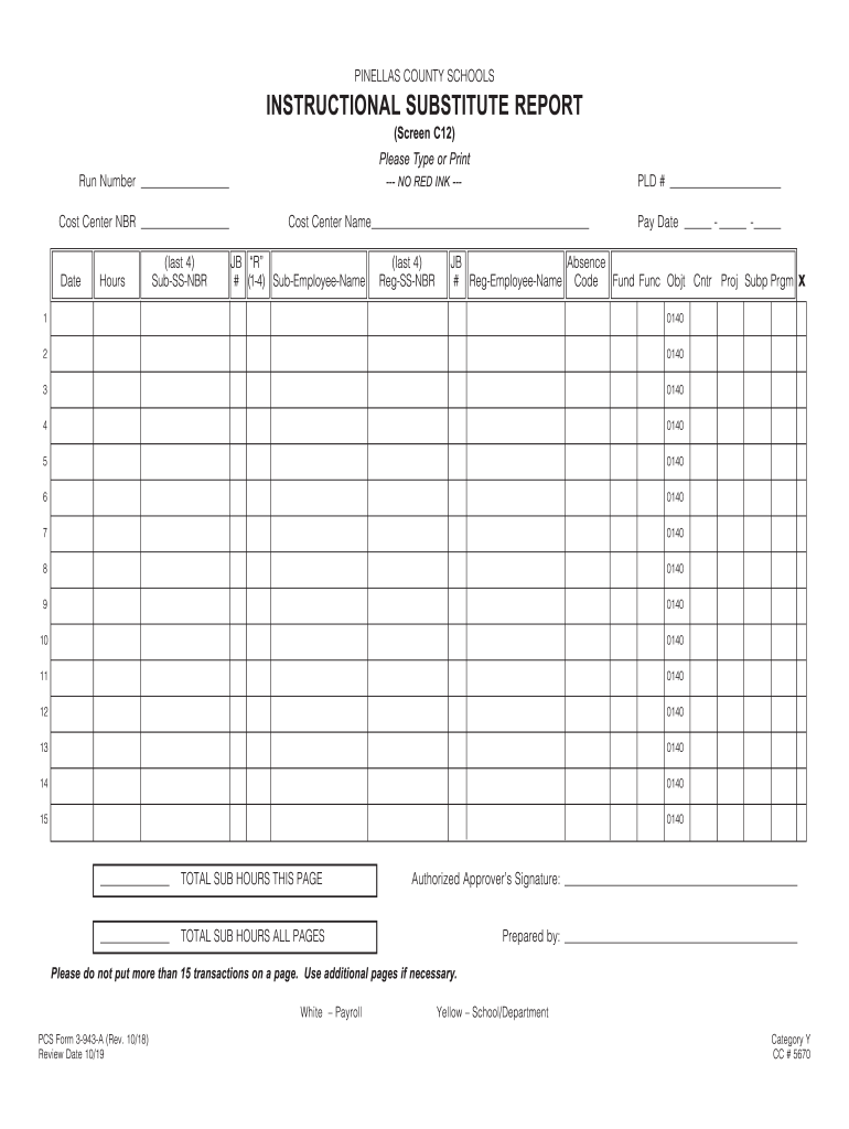 PINELLAS COUNTY SCHOOLSINSTRUCTIONAL SUBSTITUTE REPORT (Screen C12)Please Type or Print NO RED INK Run Number Cost Center NBR Gatehouse(last 4) SubSSNBRPLD # Cost Center Name JB R # (14) SubEmployeeName(last