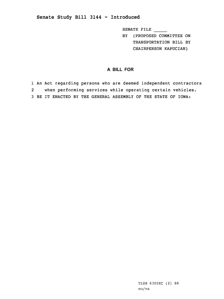 Senate Study Bill 3144 Introduced SENATE FILE BY (PROPOSED COMMITTEE ON TRANSPORTATION BILL BY CHAIRPERSON APULIAN)A BILL FOR1 An Act regarding persons who are deemed independent contractors 2 when