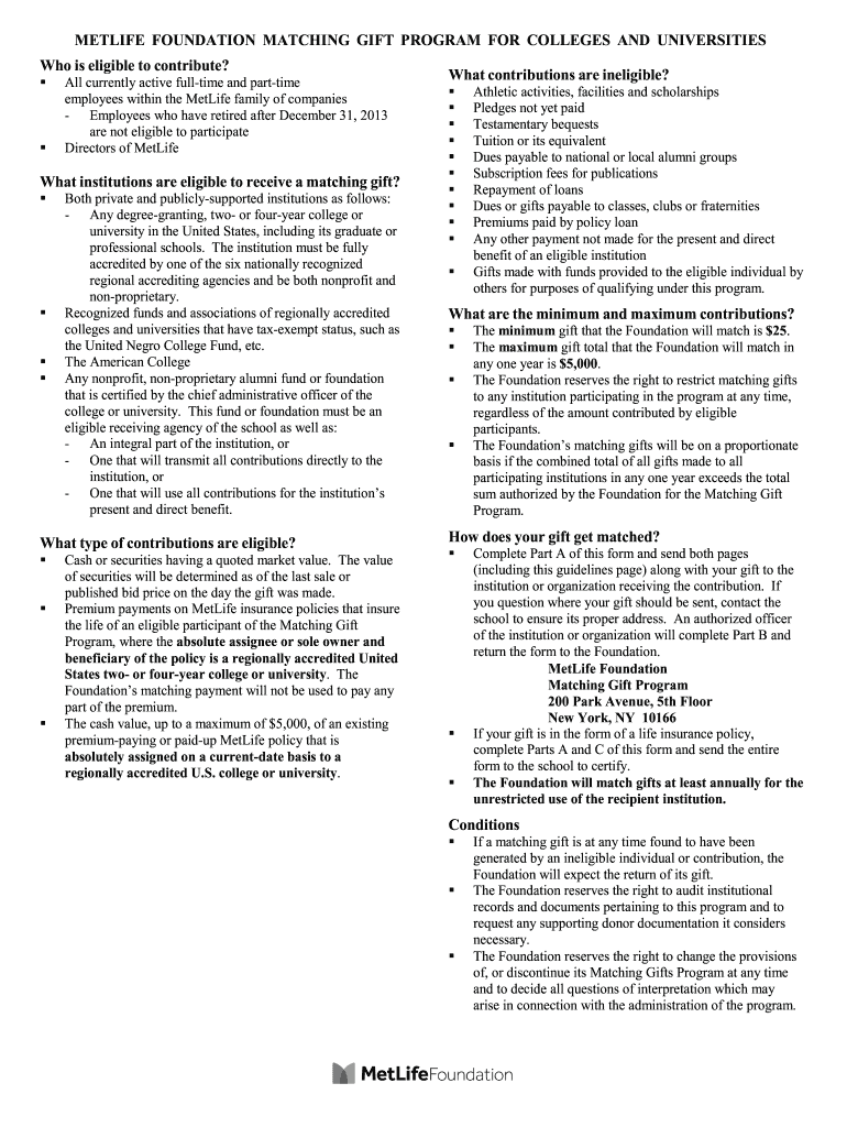 MetLife FOUNDATION MATCHING GIFT PROGRAM FOR COLLEGES AND UNIVERSITIES Who are eligible to contribute? All currently active full time and part-time employees within the MetLife family of companies