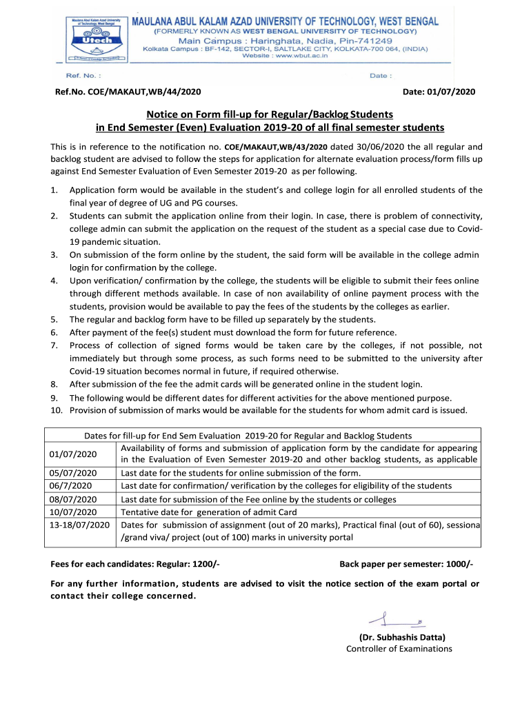 Ref.No. COE/MAK AUT, WB/44/2020Date: 01/07/2020Notice on Form fillip for Regular/Backlog Students