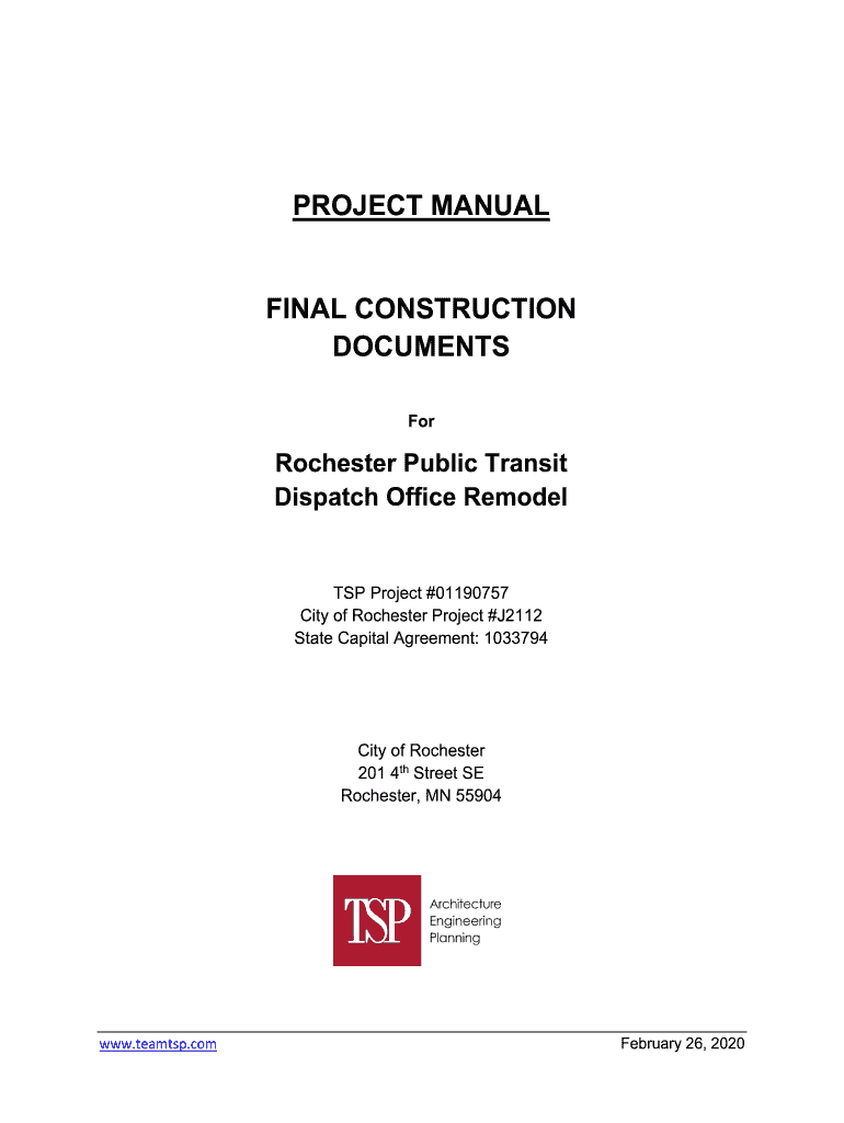 PROJECT MANUALFINAL CONSTRUCTION DOCUMENTS For Rochester Public Transit Dispatch Office Remodel TSP Project #01190757 City of Rochester Project #J2112 State Capital Agreement: 1033794City of Rochester