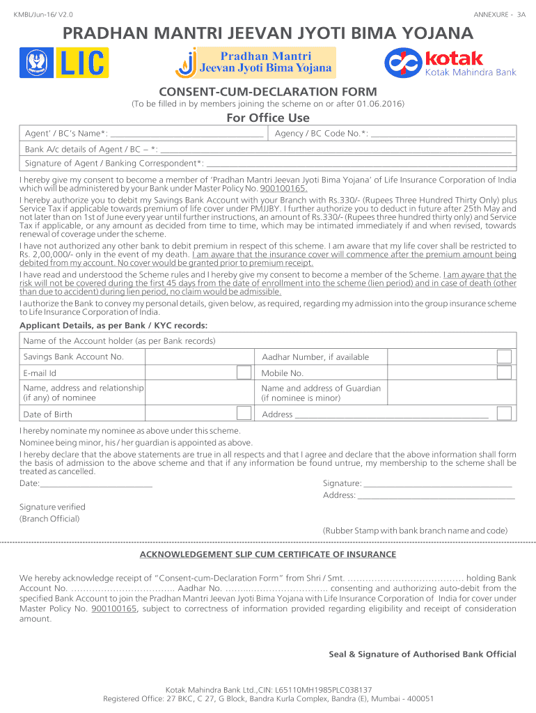 Appendix 3AKMBL/Jun16/ V2.0PRADHAN MANTRA JEEVAN KYOTO LIMA YOJANACONSENTCUMDECLARATION FORM (To be filled in by members joining the scheme on or after 01.06.2016)For Office Use Agent / BC's Name*:
