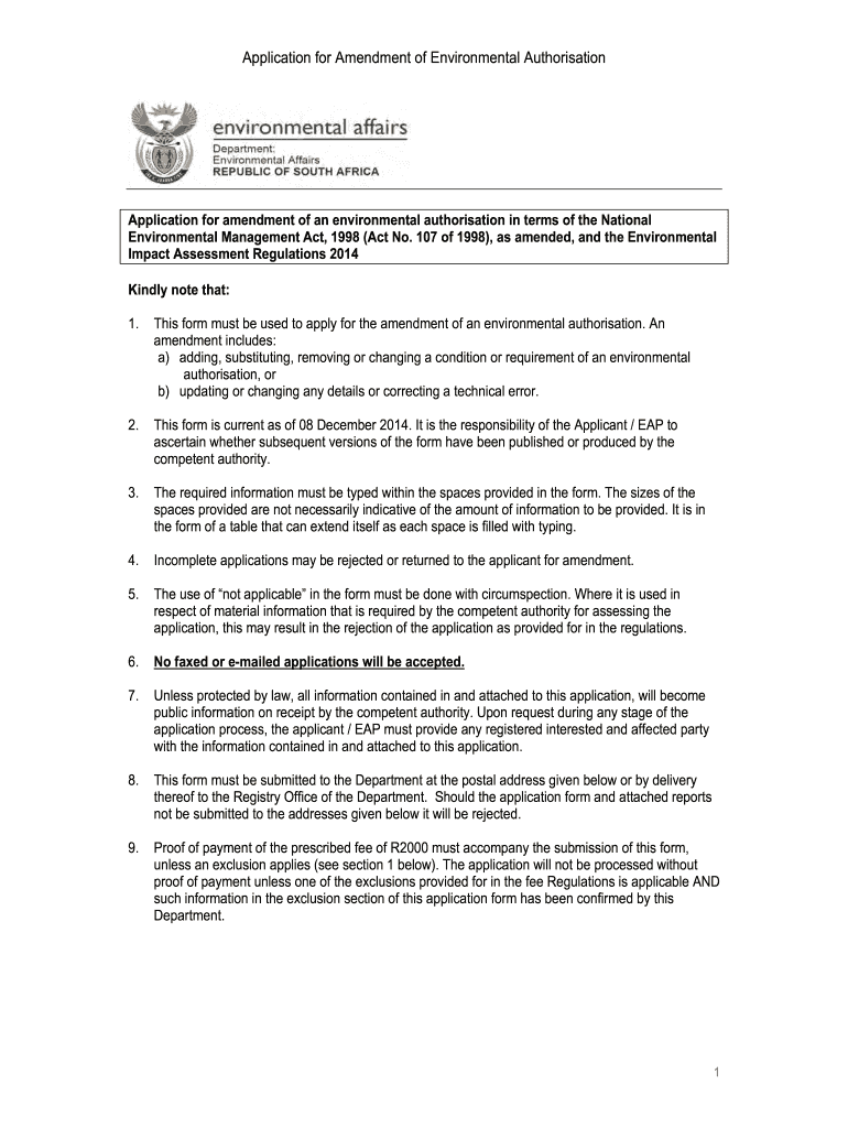 Application for Amendment of Environmental AuthorisationApplication for amendment of an environmental authorization in terms of the National