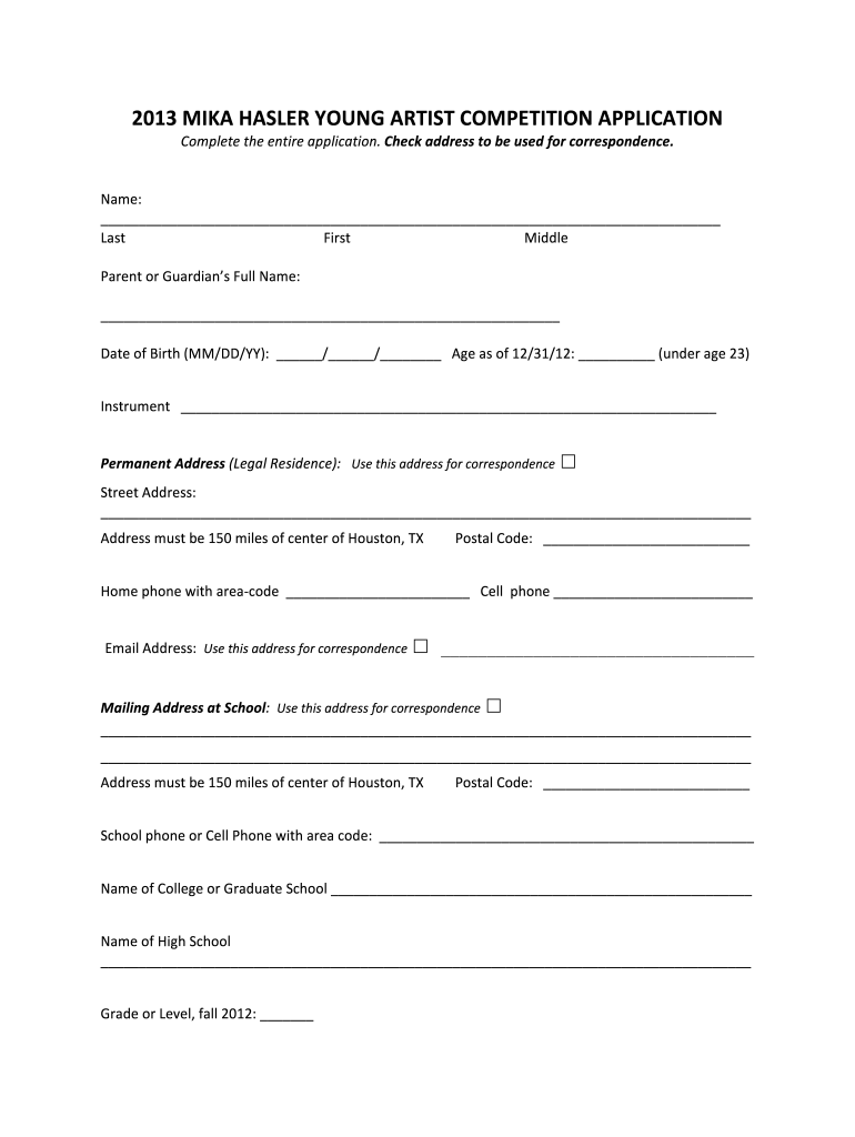 2013MIKAHASLERYOUNGARTISTCOMPETITIONAPPLICATION Completetheentireapplication. Checkaddresstobeusedforcorrespondence. Name: Last