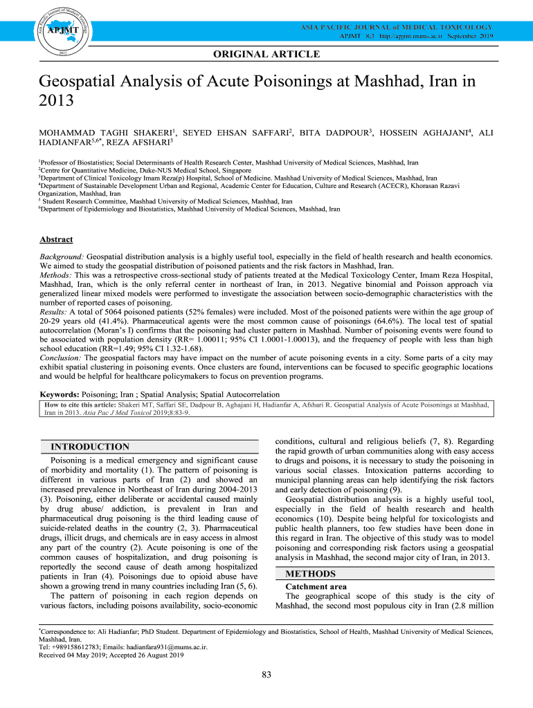APJ MT 8;3 http://apjmt.mums.ac.ir September 2019ORIGINAL ARTICLEGeospatial Analysis of Acute Poisonings at Mashhad, Iran in