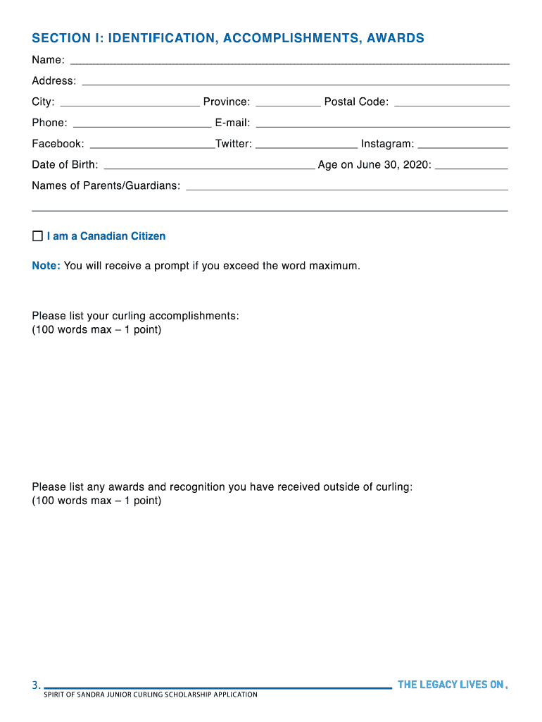 The junior curling scholarship application is a form that must be filled out by young individuals looking to apply for financial assistance to support their curling aspirations.