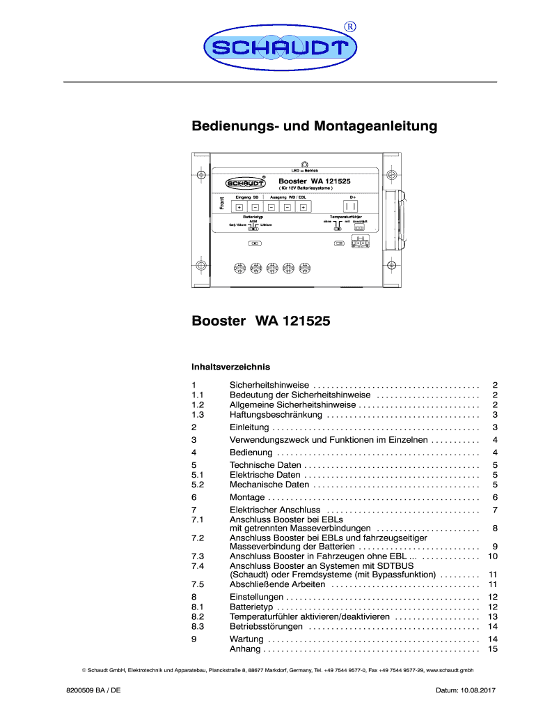 Beginnings UND MontageanleitungBooster WA 121525 Inhaltsverzeichnis 1 1.1 1.2 1.3 2 3 4 5 5.1 5.2 6 7 7.1 7.2 7.3 7.4 7.5 8 8.1 8.2 8.3 9Sicherheitshinweise. . . . . . . . . . . . . . . . . . . .