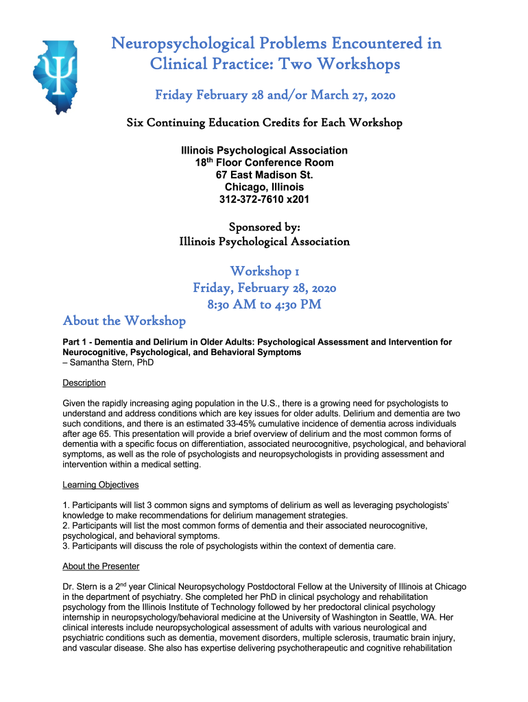 Neuropsychological Problems Encountered in Clinical Practice: Two Workshops Friday, February 28 and/or March 27, 2020, Six Continuing Education Credits for Each Workshop Illinois Psychological Association