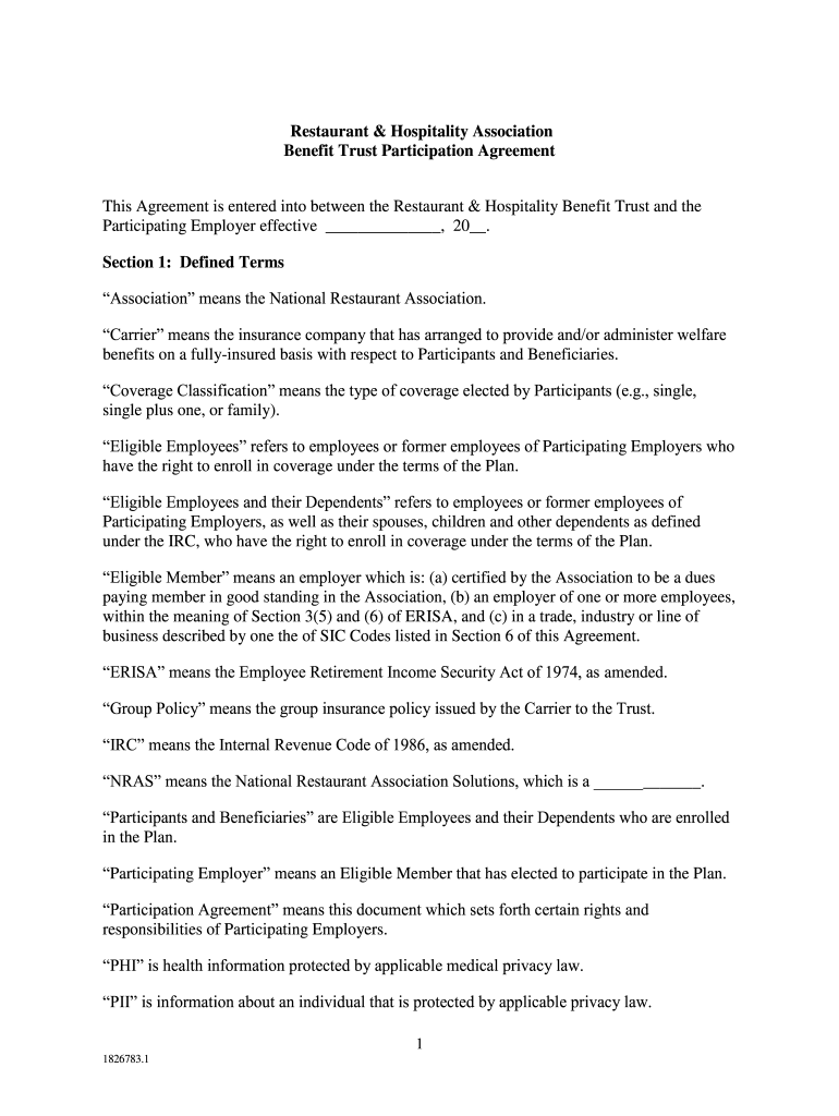 Restaurant & Hospitality Association Benefit Trust Participation Agreement This Agreement is entered into between the Restaurant & Hospitality Benefit Trust and the Participating Employer effective,