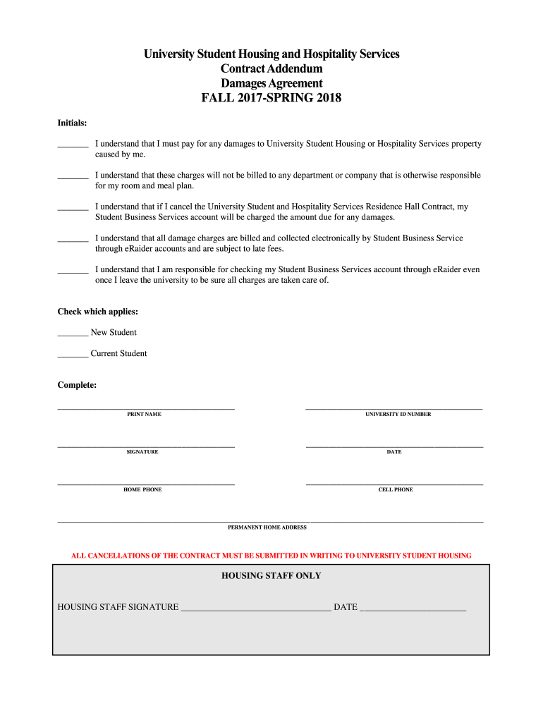 University Student Housing and Hospitality Services Contract Addendum Damages Agreement FALL 2017SPRING 2018 Initials: I understand that I must pay for any damages to University Student Housing or
