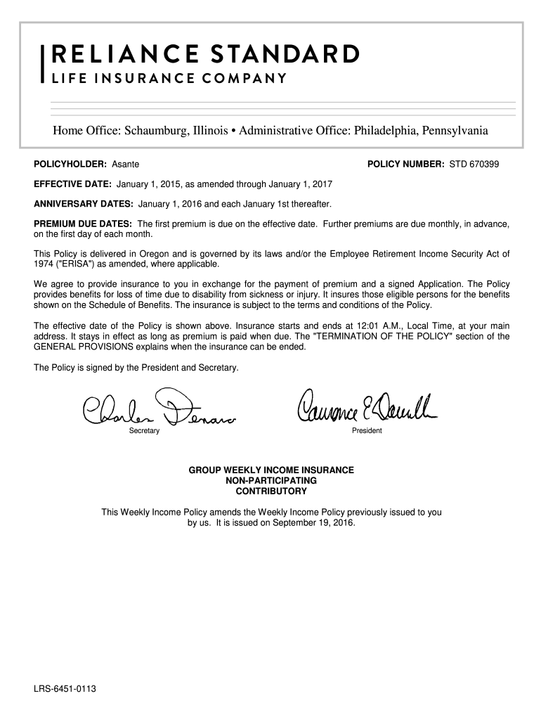 Home Office: Schaumburg, Illinois Administrative Office: Philadelphia, Pennsylvania POLICYHOLDER: AsantePOLICY NUMBER: STD 670399EFFECTIVE DATE: January 1, 2015, as amended through January 1, 2017,