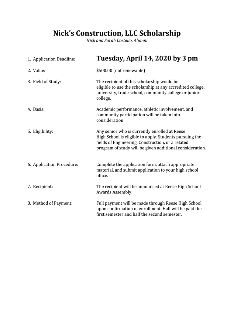 Nick and Sarah Costello, Alumni1. Application Deadline:Tuesday, April 14, 2020, by 3 pm2. Value:$500.00 (not renewable)3. Field of Study:The recipient of this scholarship