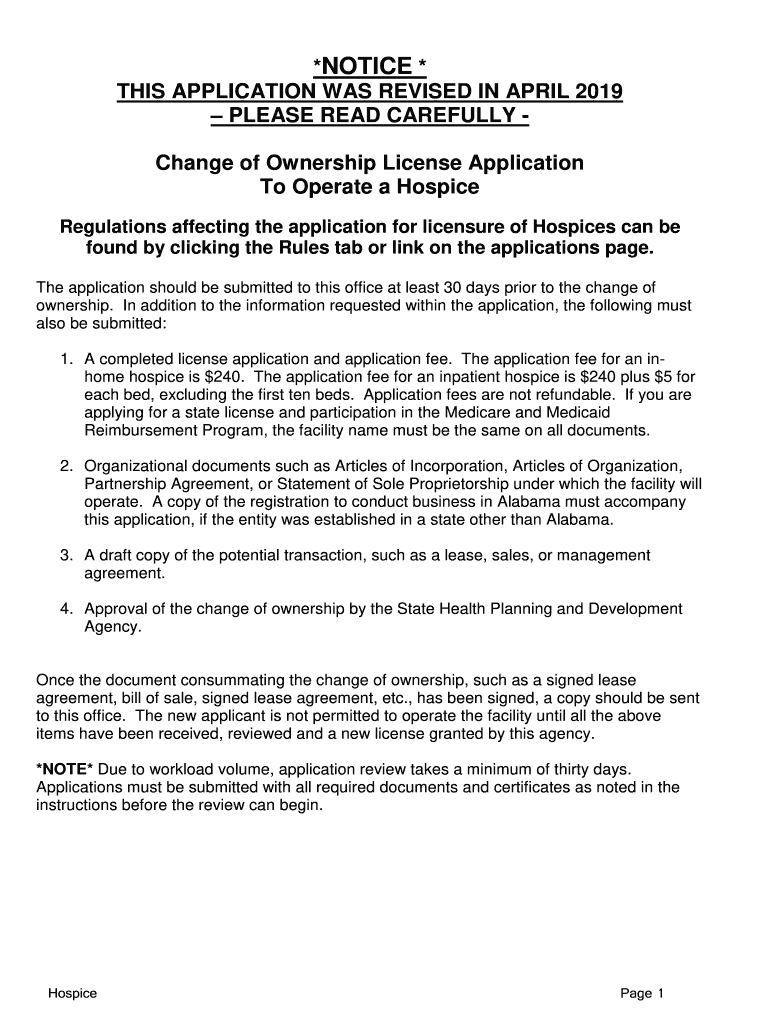 *NOTICE * THIS APPLICATION WAS REVISED IN APRIL 2019 PLEASE READ CAREFULLY Change of Ownership License Application To Operate a Hospice regulation affecting the application for licensure of Hospices