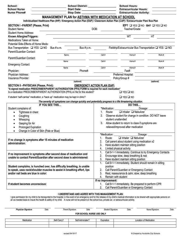 School: School Nurse Phone#School District: Start Date: Stop Date: School Hours: Extracurricular Hours: Extracurricular Activity:MANAGEMENT PLAN for ASTHMA WITH MEDICATION AT SCHOOL Individualized