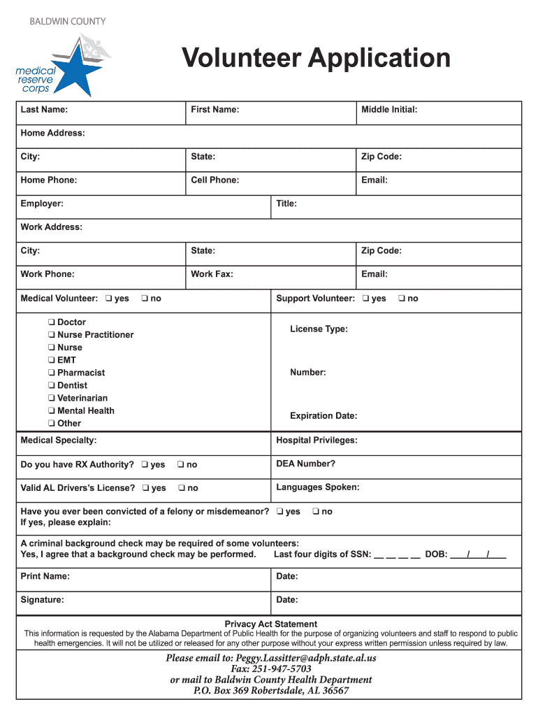 BALDWIN COUNTYVolunteer Application Last Name:First Name:Middle Initial:City:State:Zip Code:Home Phone:Cell Phone:Email:Home Address:Employer:Title:Work Address: City:State:Zip Code:Work Phone:Work